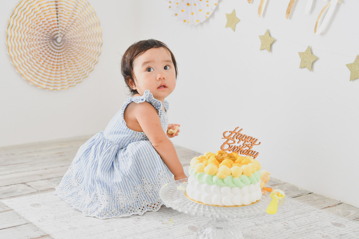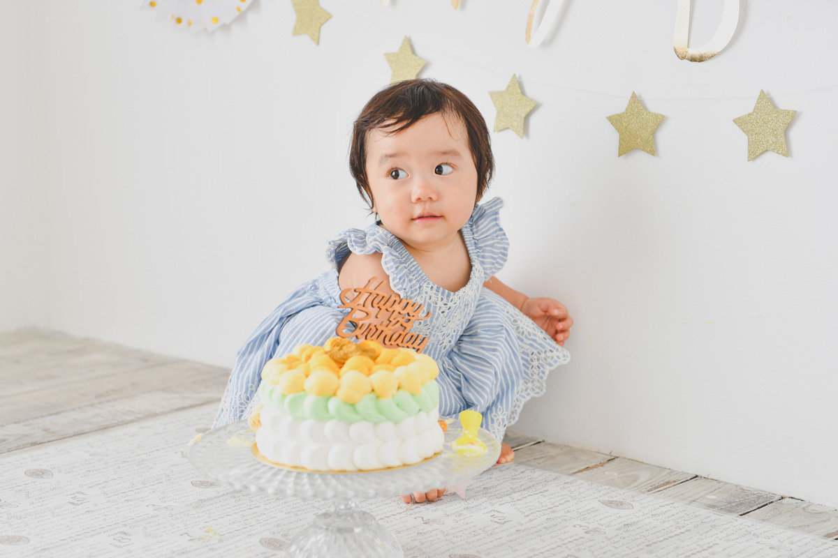 こうしたスタジオのサポートやパパママの熱心な働きかけの甲斐もあって、ケーキに近づいて手でさわったり、口の周りにクリームが付いたり、キュートな瞬間の撮影に成功しました。