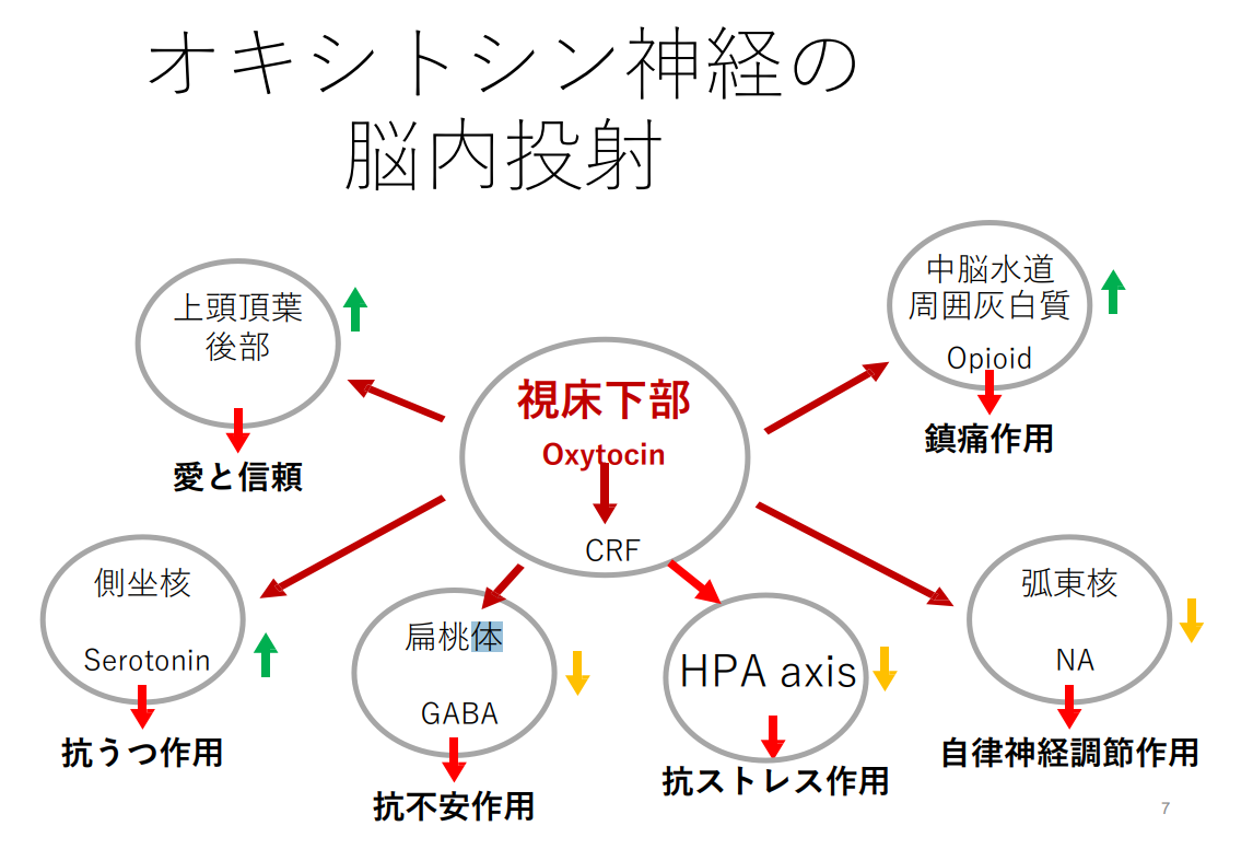 山口先生によるとオキシトシンは人間が「嬉しい、楽しい、気持ちいい」と感じた時に脳で作られ、神経を通じて脳内に投射される場所ごとに「愛情と信頼の形成」や「抗ストレス作用」といった異なる効果を生むのだそうです。