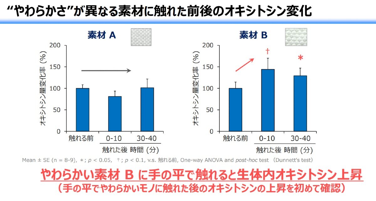感触が異なる素材に手の平で触れた前後のオキシトシンの変化を解析したところ、柔らかい素材に触れると生体内でオキシトシンが上昇したそうです。つまり、例えばパパママが育児中に子どもの身辺の物(おむつなど)の柔らかさを実感することでオキシトシンが上昇し、親子の愛着形成が促される可能性があるということ!