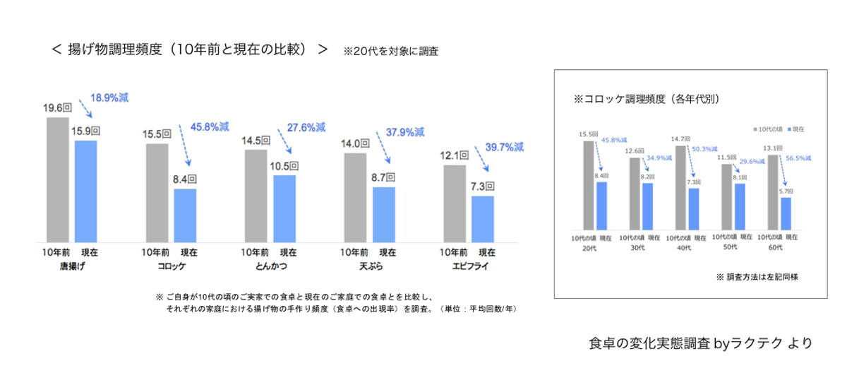 さらに、手作りの揚げ物の年間平均食卓出現率を算出したところ、いずれも減少。なかでもコロッケについては、40代・60代への調査においても手作り頻度が半減。過去には月1回以上は手料理として食卓に上がっていたが、今や2カ月に1回ほどしかないことが分かりました。