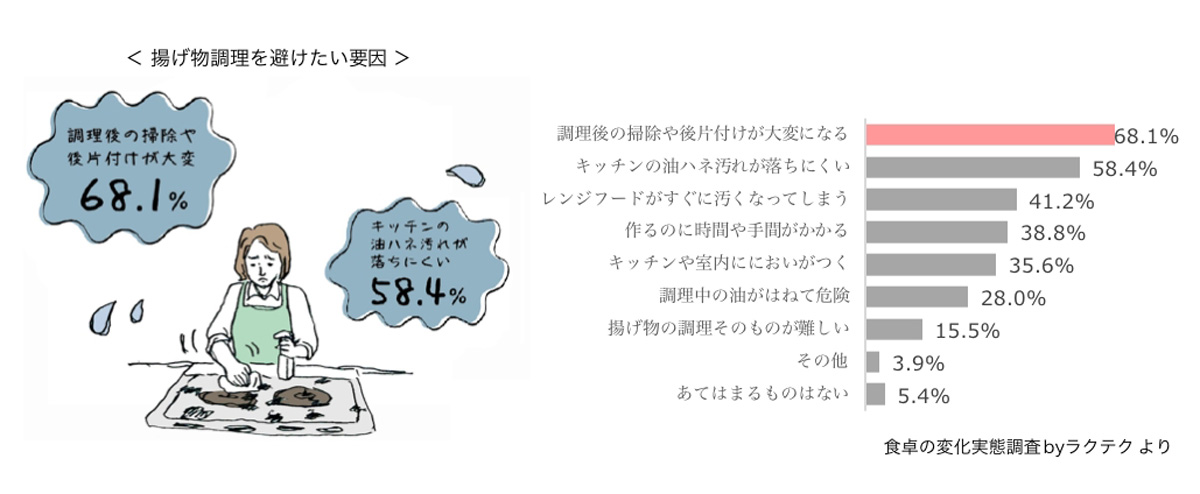 一方、4位の「作るのに時間や手間がかかる」をはじめ、「調理中の油がはねて危険」「揚げ物の調理そのものが難しい」など調理にかかる手間暇に関連する項目は下位に。意外にも調理中の手間よりも、調理後の掃除や後片付けの方が煩わしさの要因となっていることが明らかとなりました。