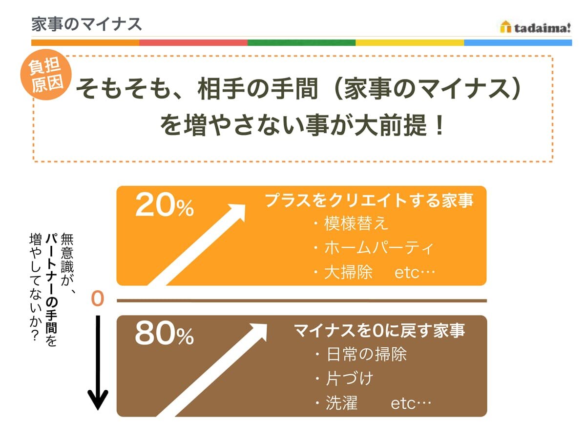 ですが、もしもパパの在宅によってパパが家事をする以上にマイナスを生み出しているとしたら…。それらを0に戻すママの家事負担はいつも以上に増えてしまうというわけです。では、パパが増やしてしまいがちなマイナスとは何か見てみましょう。