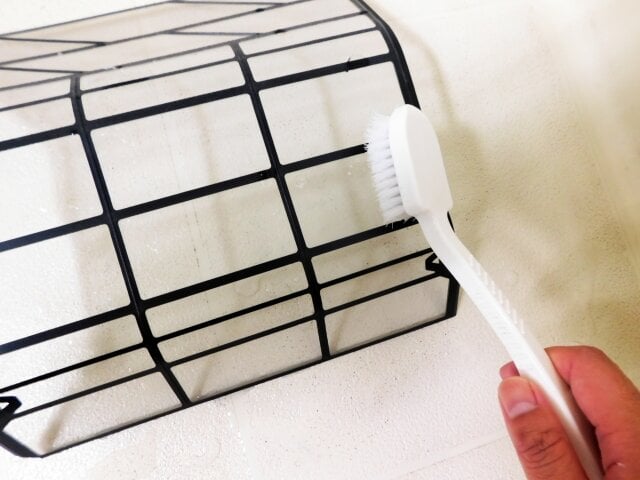 フィルターの細かい目、細部に詰まったベタつく油煙やヤニ汚れ、ぽつぽつクロカビが生えてしまっている場合などは、掃除機だけでは取りきれません。浴室等に持ち込み、中性洗剤やフィルター洗い専用ブラシなどを使って念入りに水洗いし、落としていく必要があります。