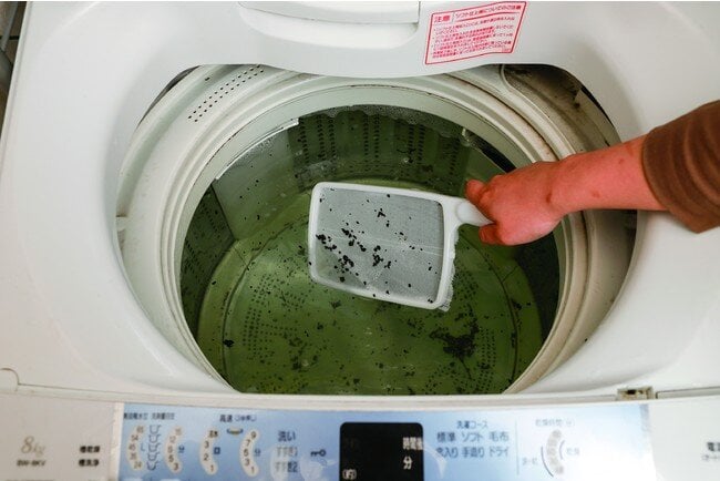 また、オキシクリーンによるオキシ漬けは、見えない場所の汚れにも効果を発揮! 洗濯機にお湯を⾼⽔位まで⼊れてからオキシクリーンを⼊れ、5分ほど回して最大6時間放置すれば、洗濯槽の汚れがこんなにも落とせますよ(浮いてきた汚れをすくい取ってから排⽔し、通常の洗濯コースを回してください)。