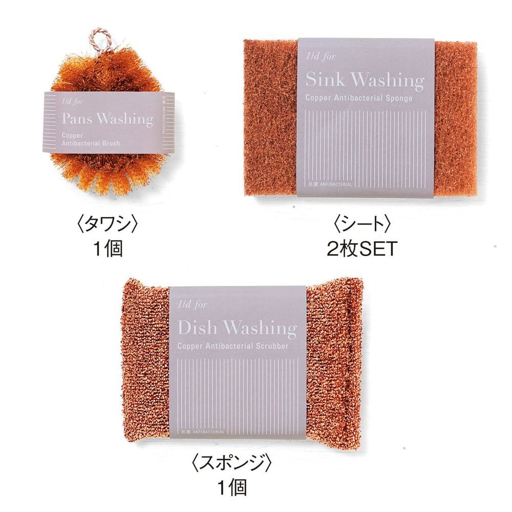「1/d 銅の抗菌スポンジ・タワシの会」とは、キッチンの洗い仕事に不可欠な3アイテムをセットで購入できるシリーズ。初回に一度申し込めば、銅の特性を生かした〈タワシ〉、磨き用〈シート〉、〈スポンジ〉が毎月1種類ずつ届くようになっています。どのツールも、傷はつきにくいのに汚れはしっかりかき取る構造。さらに、赤銅色の道具然としたたたずまいでキッチンを引き締める、男性も使いたくなるデザインもまた魅力です。