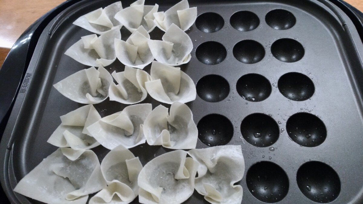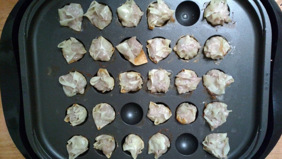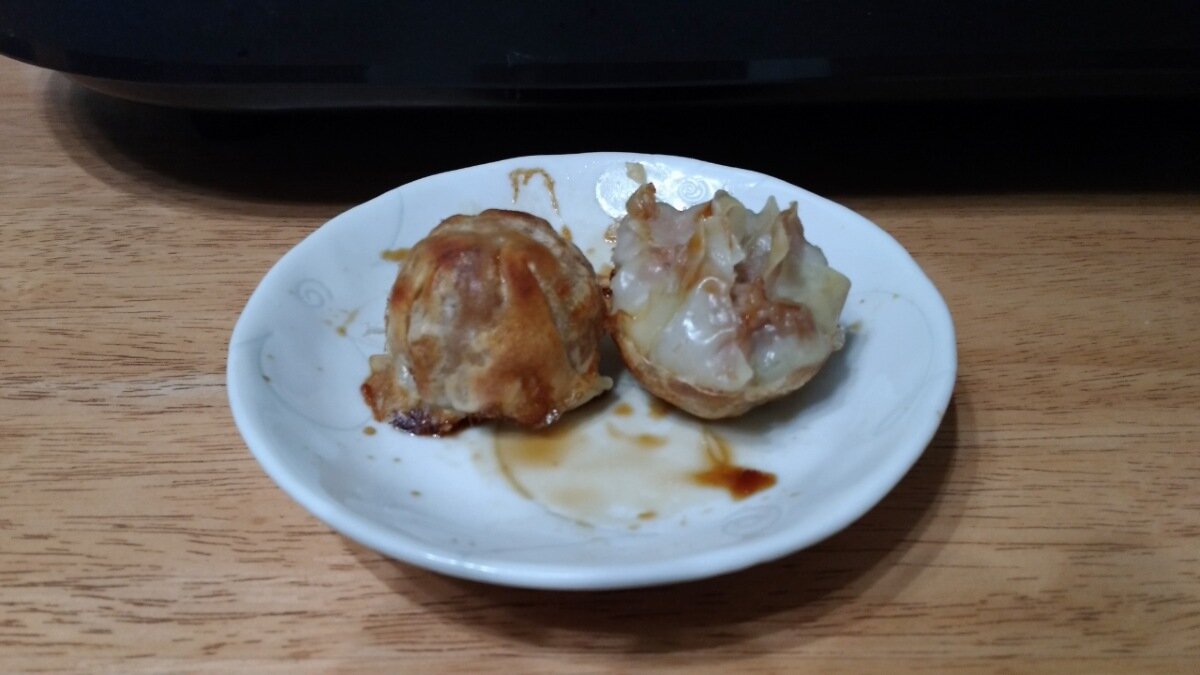 火力が強すぎたのと蒸し用の水の量が少なかったせいか、揚げ焼売のようにカリッとした焼き上がりになってしまいましたが、家族からは「焼売の味だよ」「皮が固めだけどイケる」と好評でした。“たこ焼き器で焼売を作る”という意外性の面白さも含めて、ぜひオススメです!