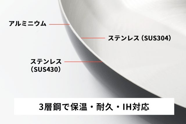 ステンレスは保温性の高い素材ですが、予熱に時間が掛かるという欠点があります。kübellのフライパンはステンレスの間に熱伝導率の高いアルミを挟んだ「アルミクラッド3層鋼」を使用。アルミの熱伝導率の高さとステンレスの保温性が合わさり、じっくり火を通しながら料理を美味しく仕上げることが可能です。またニッケルの含有量の異なる2種類のステンレスを使うことで、耐食性に優れながらIHクッキングヒーターにも対応。