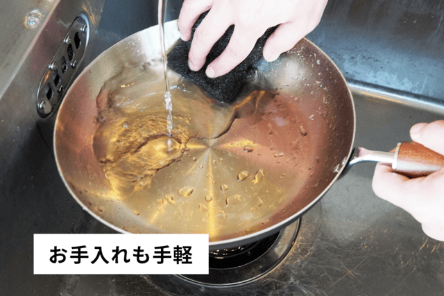 ステンレスは他の金属に比べてさびに強いのが特徴。調理後、すぐに洗ったり水につけておけば汚れも落としやすく、しかも洗剤とスポンジでらくらくお手入れ。鉄フライパンに必須の「油ならし」も必要ありません。
