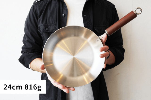 サイズは24cm。重いイメージのあるステンレスですがkübellのフライパンは816g。しっかりした造りでも扱いやすい軽さが特徴です。フッ素加工をしていないので、空焚きをしてしまっても安心。家族とのちょっとしたアウトドアイベントにも連れて行ってもらえるよう、外面にはセラミック塗装を施してあります。耐熱温度は700度で焚き火調理にも対応。家での料理だけではなくお庭や河川敷でのBBQ、デイキャンプの焚き火調理でも活躍してくれます。