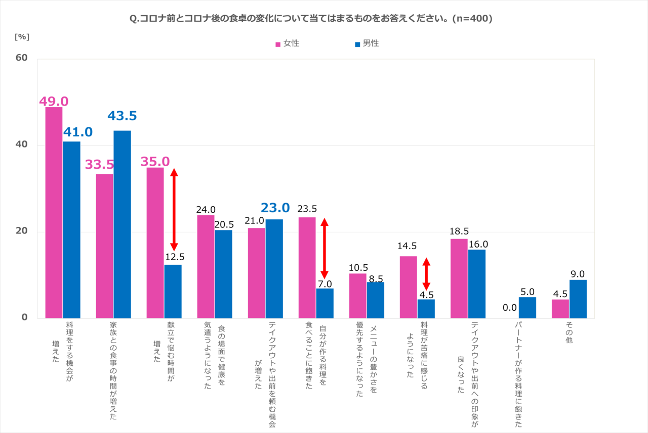 株式会社クレハが共働きの20代~40代夫婦400名を対象に行った「食卓環境の変化」に関する調査(※)によると、新型コロナウイルス感染拡大前と後の食卓の変化について「料理をする機会が増えた(45.0%)」という回答が1位。しかし順位以上に注目したいのは、2位以下の男女間の回答比率のギャップ。「献立で悩む時間が増えた」「自分が作る料理を食べることに飽きた」「料理が苦痛に感じるようになった」という回答がいずれも夫は妻よりも10~20%低く、料理を主に担当する妻のリアルな負担に夫が気づいていない様子が伺えます。