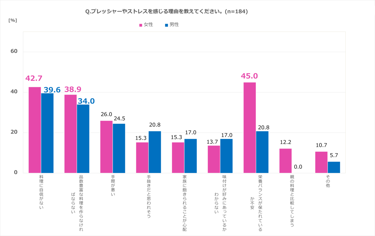 さらに、料理においてプレッシャーやストレスを感じるタイミングについて尋ねたところ、「夕食の準備をする時」が88.6%でダントツ。その理由として「料理に自信がない(45.0%)」や「品数豊富な料理を作らなければならない(38.5%)」が多く挙がり、妻のみの統計で最多だったのが「栄養バランスが保たれているか不安(45.0%)」。ちなみにこの回答も夫とは約25%ものギャップがありました。