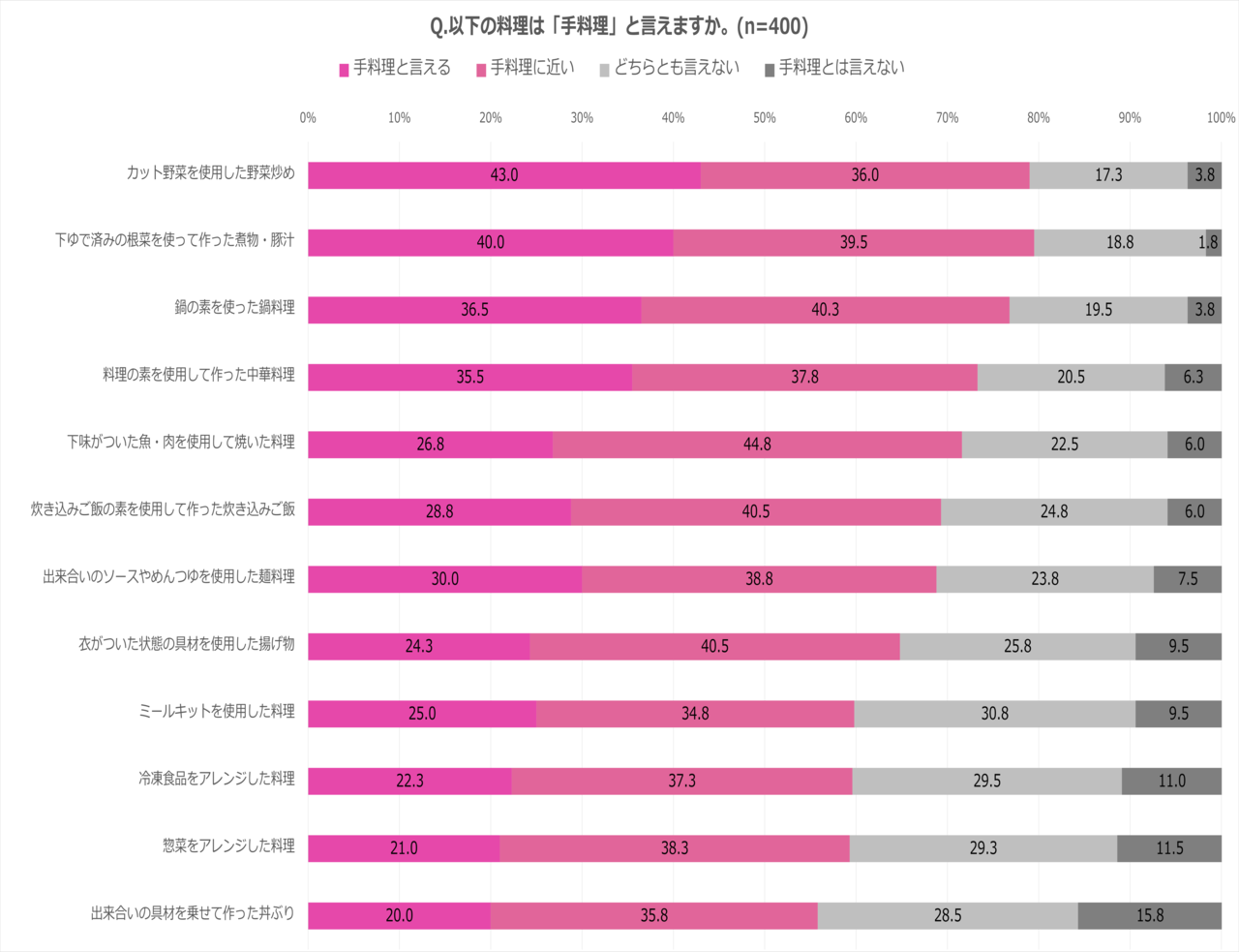 では、どこからどこまでが手料理にあたるのか? クレハの同調査で「手料理と言える」「手料理に近い」の回答が少なかったのは、少ない順から「出来合いの具材を乗せて作った丼ぶり(55.8%)」「惣菜をアレンジした料理(59.3%)」「冷凍食品をアレンジした料理(59.6%)」。使用する食材の加工度合いが上がると、調理をしても手料理とは言いがたいという意識傾向が伺えます。