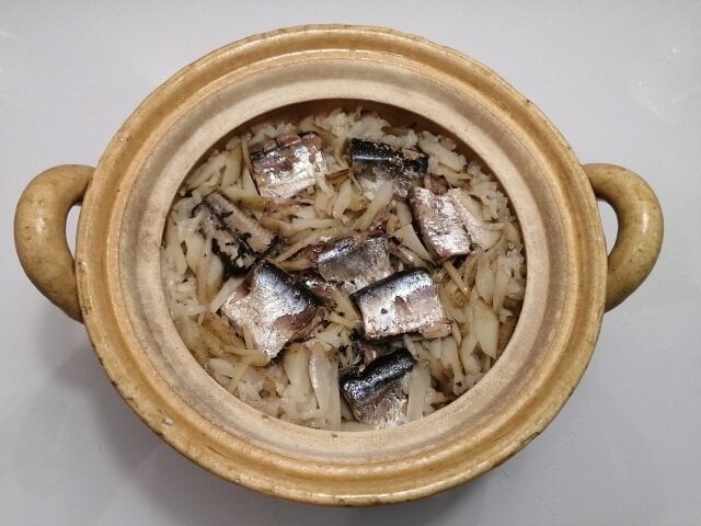 ②土鍋や炊飯器に洗った米、ごぼう、生姜を入れ、いわし缶の煮汁、醤油、酒、みりんを加え、通常の2合炊きの分量の水を入れる