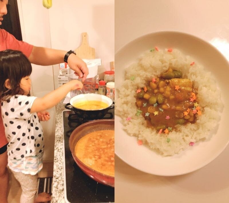畠山さんは普段からお料理を自分でされるとのことで、ハチカレーさんのルーを使いつつ、ココナッツミルクやかつおだしなどで味付けをされたとのこと!数の子、枝豆、コーンなどご家族が好きな食材を入れる斬新なアイデアがつまったカレーの出来上がりです!また、父の日というイベントだからこそ『普段子どもと一緒に食べられるカレーはこういう機会じゃないと考えれなかった』ともおっしゃっていました。父の日がパパをはじめ、家族にとって特別な日になったのではないでしょうか…!