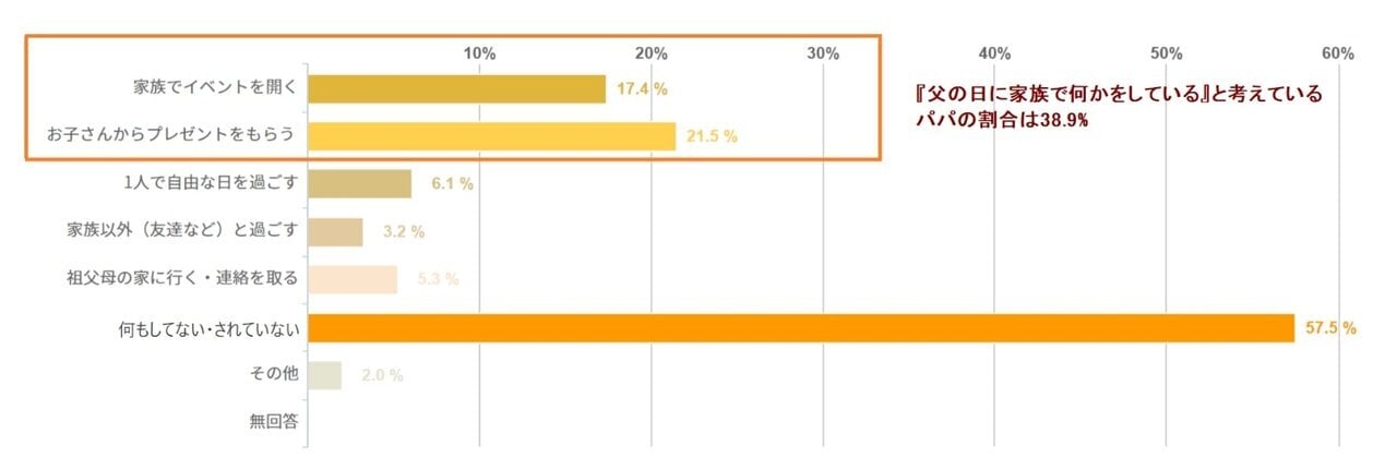 今年6月に家menが行った調査によると、「父の日は例年どのように過ごしていますか」と尋ねたところ、「何もしてもらっていない」と回答したパパが過半数越えの57.5%。