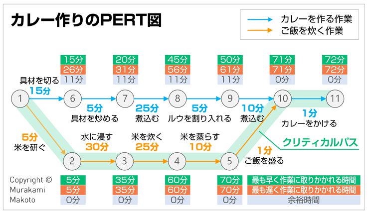 カレー作りのPERT図でのクリティカルパスは余裕時間が0分のラインで、ご飯を炊く作業ラインだと分かります。