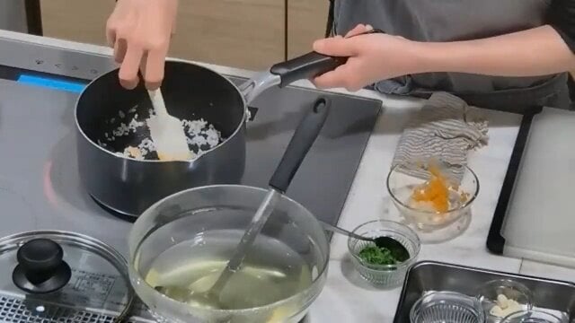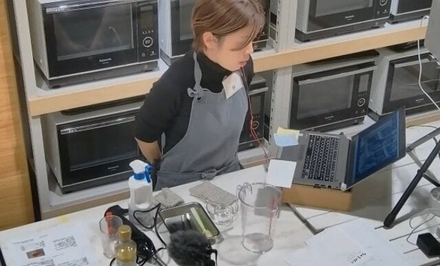 講座は通常の料理教室と同じく、講師がお手本を示しながら調理手順とポイントを解説する形で進行。調理する講師の手元が斜め上のアングルからカメラで映され、作業の具体的な進め方が確認しやすくなっています。レシピ本で文字の説明を読んでいるだけだと、調理の途中で「このやり方で間違ってないかな」「この出来上がりで十分なのかな」とつい不安になりがちですが、各工程のお手本がしっかり目に見えると安心ですね。