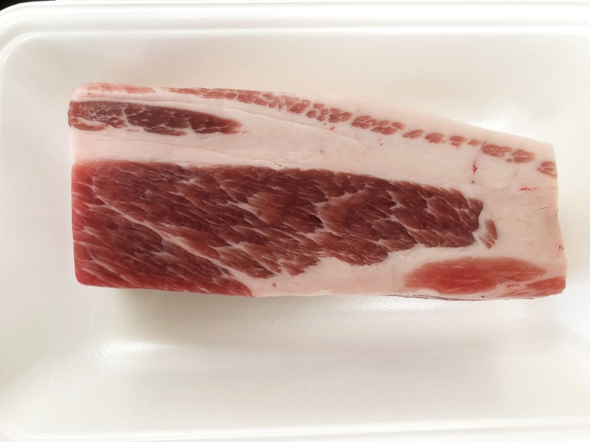 その点、カナダ産やアメリカ産の豚バラ肉はちょうどいい塩梅なのですが、私はどうも国産へのこだわりがあって、いつも「国産肩ロース肉」を使います。脂の量といい、柔らかさといい、私好みのベーコンになります。