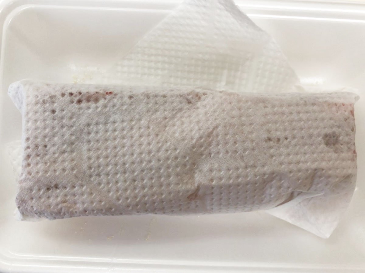 砂糖をまぶしたら、キッチンペーパーに包んで冷蔵庫で1時間置きます。