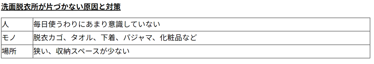 まずは他の部屋と同様、人・モノ・場所の3つの要素から、洗面脱衣所が片づかない一般的な原因を見ていきましょう。