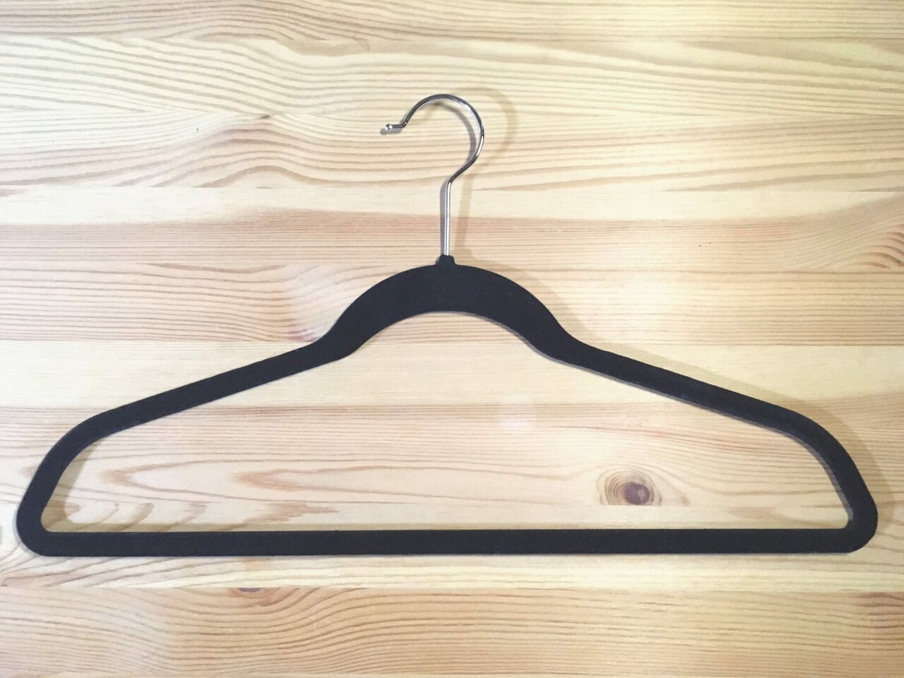ノンスリップハンガーには上写真のように表面がベロア処理されたもののほか、ビニルコーティングされたものもあります。もちろんそれもOKですが、弓なりの1本もので一般的な三角形になっていない場合は、パンツとセットで掛けるような使い方はできないのが少し不便です。