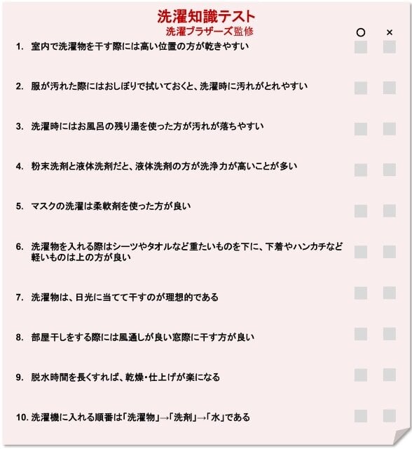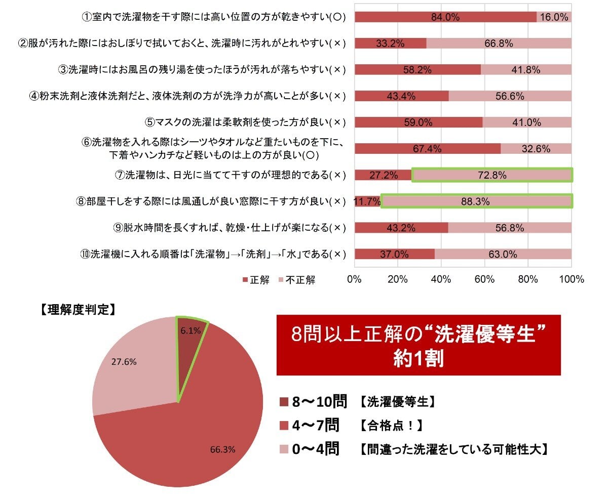 今回の調査では洗濯に関する理解度を確かめるため、洗濯ブラザーズ監修の「洗濯知識テスト」を併せて実施。解答と正解比率は下の図となりますが、全10問中8問以上正解した“洗濯優等生”は全体の約1割。ちなみに最も正答率が低かったのは「部屋干しをする際には風通しが良い窓際に干すのが良い」、続いて「洗濯物は日光に当てて干すのが理想的である」でした。皆さんは正解が分かりましたか?