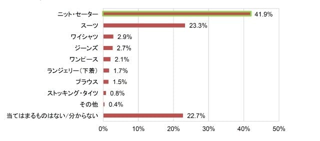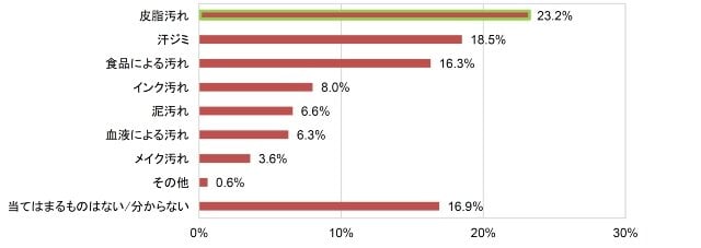 洗濯の最大の目的は汚れを落とすこと。その汚れの中でもキレイに落とすのが難しいと感じるものを尋ねたところ、1位は「皮脂汚れ」の23.2%、2位は「汗ジミ」の18.5%という結果に。また、洗濯する際に洗うのが難しい服については「ニット・セーター」が約4割で最多となりました。