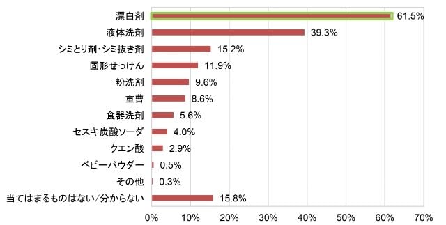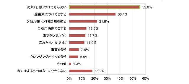 洗濯機だけでは落としづらい衣類の汚れをどのように落としているか尋ねたところ、最も多かったのは「洗剤(石鹸)につけてもみ洗い」で55.6%。続いて「漂白剤につけてこする」(36.4%)、「シミ取り剤・シミ抜き剤を塗る」(21.8%)、「台所用洗剤でこする」(13.5%)などがランクイン。また、衣類の黄ばみを落とす際に使用するものを調査した結果、「漂白剤」が61.5%でダントツの1位。「液体洗剤」が2位で39.3%でした。