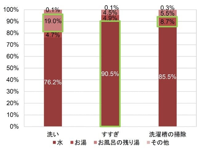 洗濯で水・お湯・お風呂の残り湯のうちどれを使用するか尋ねたところ、洗い・すすぎ・洗濯槽の掃除いずれも「水」が大多数。一方、他2つの使用比率に注目すると、お湯は「洗濯槽の掃除」をする際、お風呂の残り湯は「洗い」の際に多いことが分かりました。