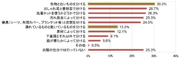洗濯する際の「衣服の仕分け」について調べたところ、最も多かったのが「色物と白いものを分ける」で30.3%。続いて「おしゃれ着と普段着で分ける」「洗濯ネットを使うかで分ける」「汚れ具合で分ける」などが僅差で並ぶ結果に。一方で、「濡れているものと乾いているもの」を分ける方は13.2%と少ないことも判明しました。
