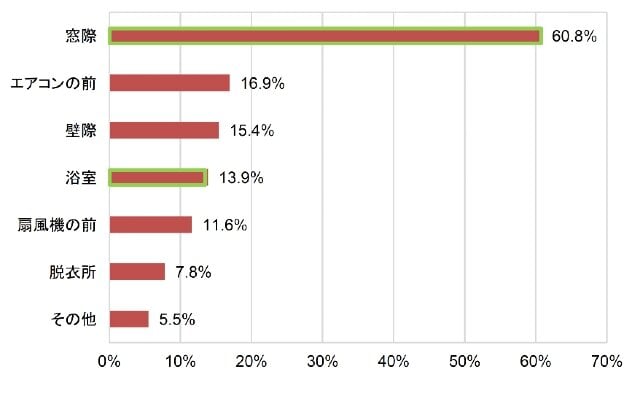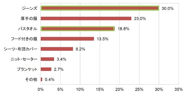 近年は季節や天気に関係なく常に部屋干しを行っている家庭が少なくありませんが、部屋干しの際にどこに洗濯物をかけているか調べたところ、「窓際」が60.8%。2位の「エアコンの前」(16.9%)を寄せつけないダントツの1位に。また、部屋干しで乾きにくいと思う洗濯物については、「ジーンズ」「厚手の服」「バスタオル」が上位を占めました。