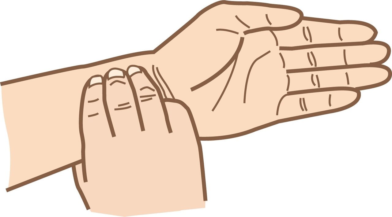 また特に道具がなくても、下の画像のように手首の親指側にある動脈に人差し指・中指・薬指を当てて自分で脈拍数を数えることもできます。15秒で何回拍動を感じるか数えて、その数値を4倍することで1分間の心拍数のおおよその値を推定する方法です。