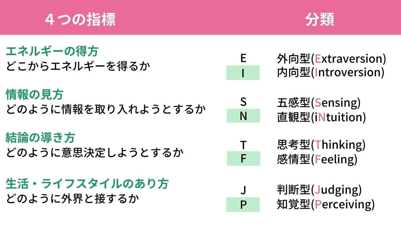 4つの指標にはそれぞれ2つのパターンがあり、どちらの傾向が強いかを探っていくことでタイプが見えてきます。各タイプは「ISTJ」「ENFP」などアルファベット4文字で表され、16パターンのどれか一つのタイプに診断することができます。