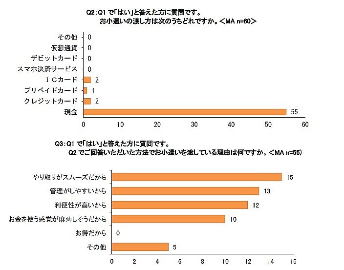 さらに「ご回答いただいた方法でお小遣いを渡している理由は何ですか」という質問には、「やり取りがスムーズだから」(15)という回答が最も多く、続いて「管理がしやすいから」(13)、「利便性が高いから」(12)、といった理由が多く挙がりました。