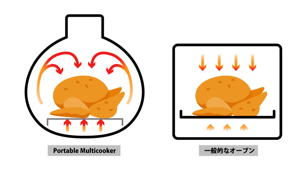 「焼く」「蒸す」「スモーク(燻製)」「炒める」「揚げる」おいしいオーブン料理を高速加熱で手早く仕上げ、しかも軽量タイプなので家でも外でも手軽に使える「Portable Multicooker」。