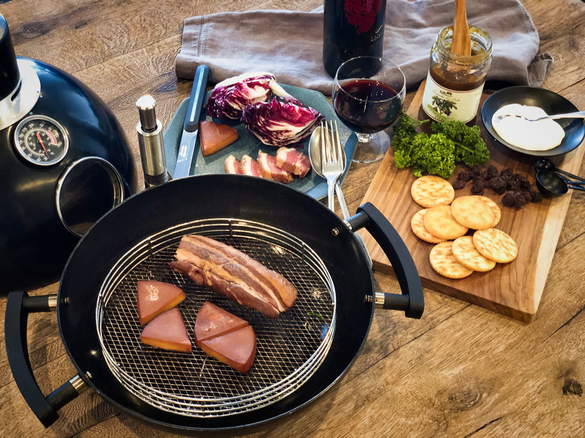 火にかけた後の待ち時間も極上の楽しみ! チーズやベーコンなどお好みの食材で燻製を堪能しましょう。