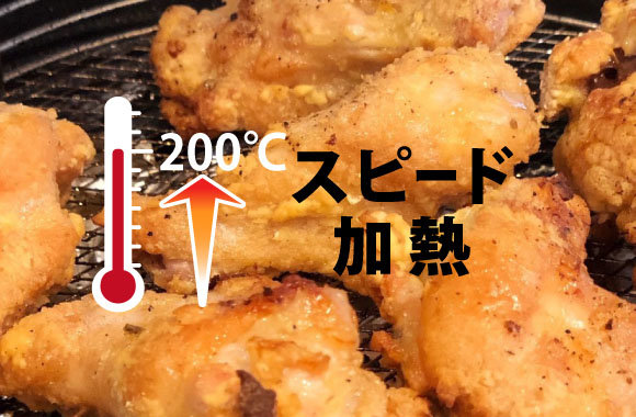 一般的な家庭用オーブンでは上からの加熱が基本で、食材はトレーの上に乗せるため、水分が多い食材の底面はベタッとなりがち。