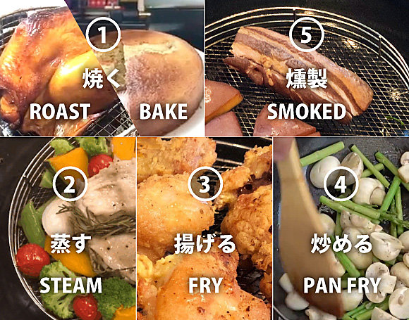 焼く/蒸す/スモーク(燻製)/炒める/揚げるなどさまざまな使い方が可能。これ一つでいろいろな調理法が楽しめます。